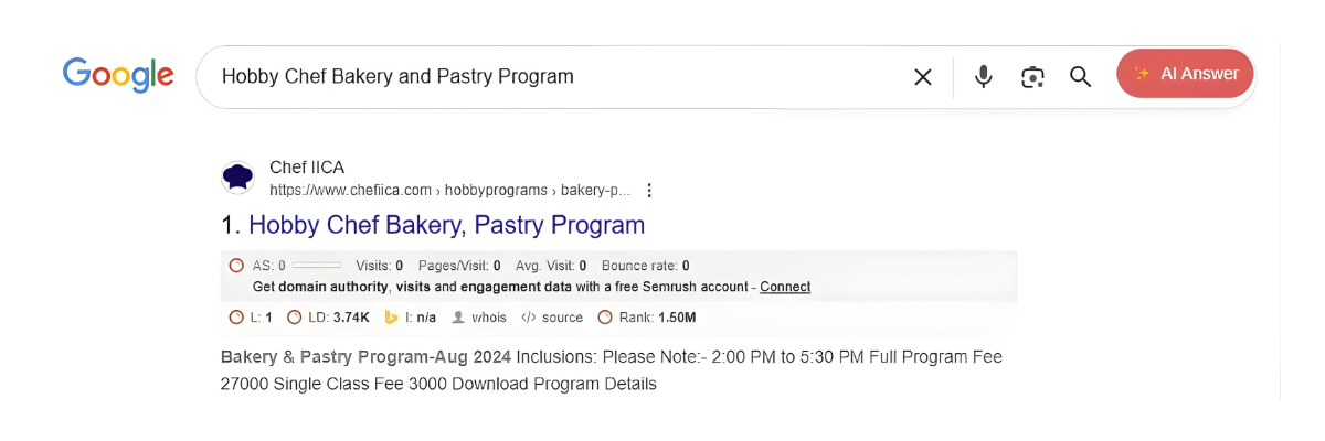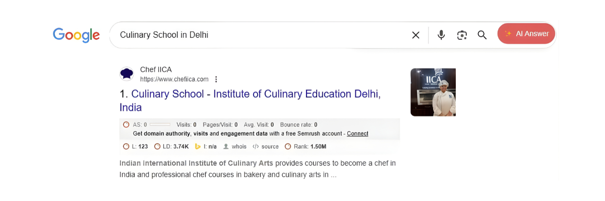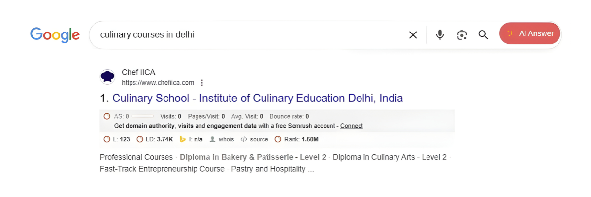 We strengthened IICA’s SEO foundation by optimising key course pages, upgrading on-page content, and improving the technical health of the website — enabling IICA to rank prominently on Google and AI search for high-intent culinary and bakery-related keywords. To enhance IICA’s organic visibility and connect with aspiring chefs across Delhi NCR and India, we implemented a comprehensive SEO strategy tailored for culinary education- focused on discoverability, relevance, and stronger conversion intent. Key components included: