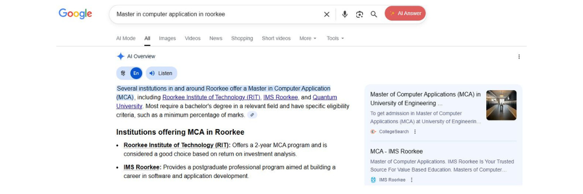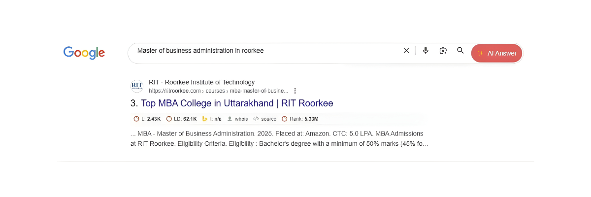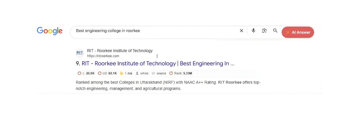 Roorkee Institute of Technology (RIT) is one of the top-ranked colleges in Uttarakhand offering industry-aligned programs in MBA, B.Tech, B.Sc. Agriculture, BCA, BBA, Paramedical Sciences, and B.Ed. Recognized for academic excellence and top placements, RIT Roorkee is a preferred choice among students across India. RIT wanted to partner with a digital marketing agency in Noida which could help generate brand awareness, increase organic growth and leads for their courses.